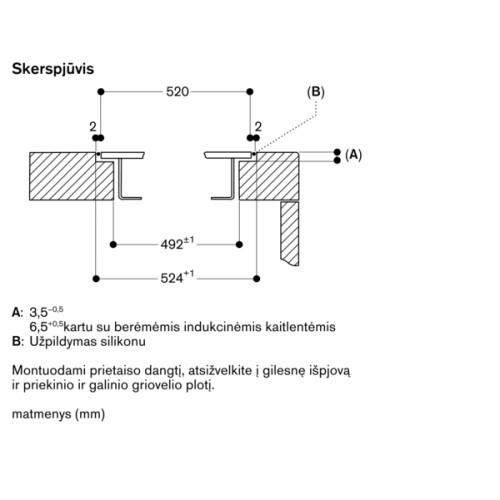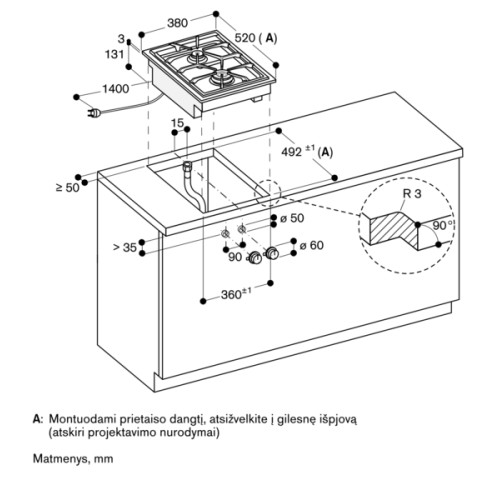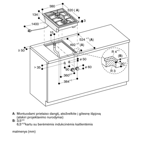 • Įleidžiamas montavimas galimas į akmens, sintetinius ar masyvo medienos stalviršius – būtinas atsparumas karščiui ir sandarumas