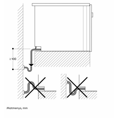 - Išleidimo žarna negali būti aukščiau nei prietaiso apatinis kraštas. Ji taip pat turi būti bent 100 mm žemiau nei prietaiso išleidimo anga (žr. brėžinį „drain connection“)