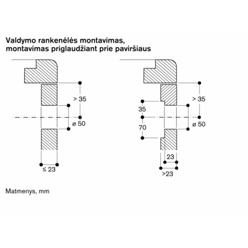 - Jei valdymo skydelio storis viršija 23 mm – būtina galinė išpjova pagal brėžinį „Installation of the control knob“