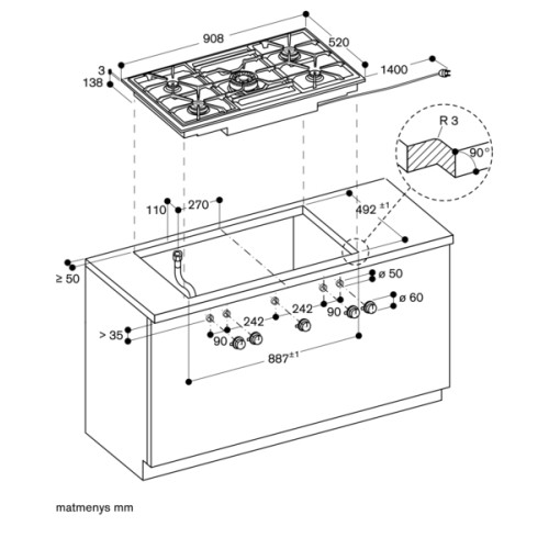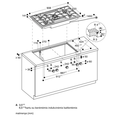 - Įleidžiamas montavimas galimas į akmens, sintetinius ar masyvo medienos stalviršius – būtinas atsparumas karščiui ir sandarumas