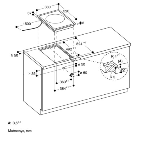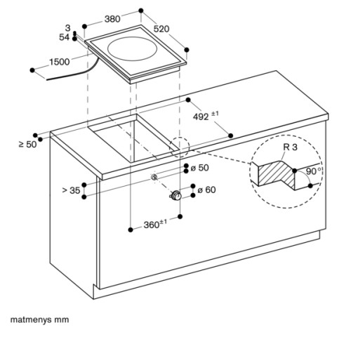 - Įleidžiamas montavimas galimas į akmens, sintetinius ar masyvo medienos stalviršius – būtinas atsparumas karščiui ir sandarumas
