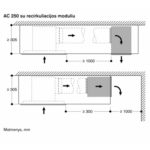 • Atstumas virš dujinių prietaisų: min. 65 cm (jei bendra galia >12 kW – min. 70 cm).